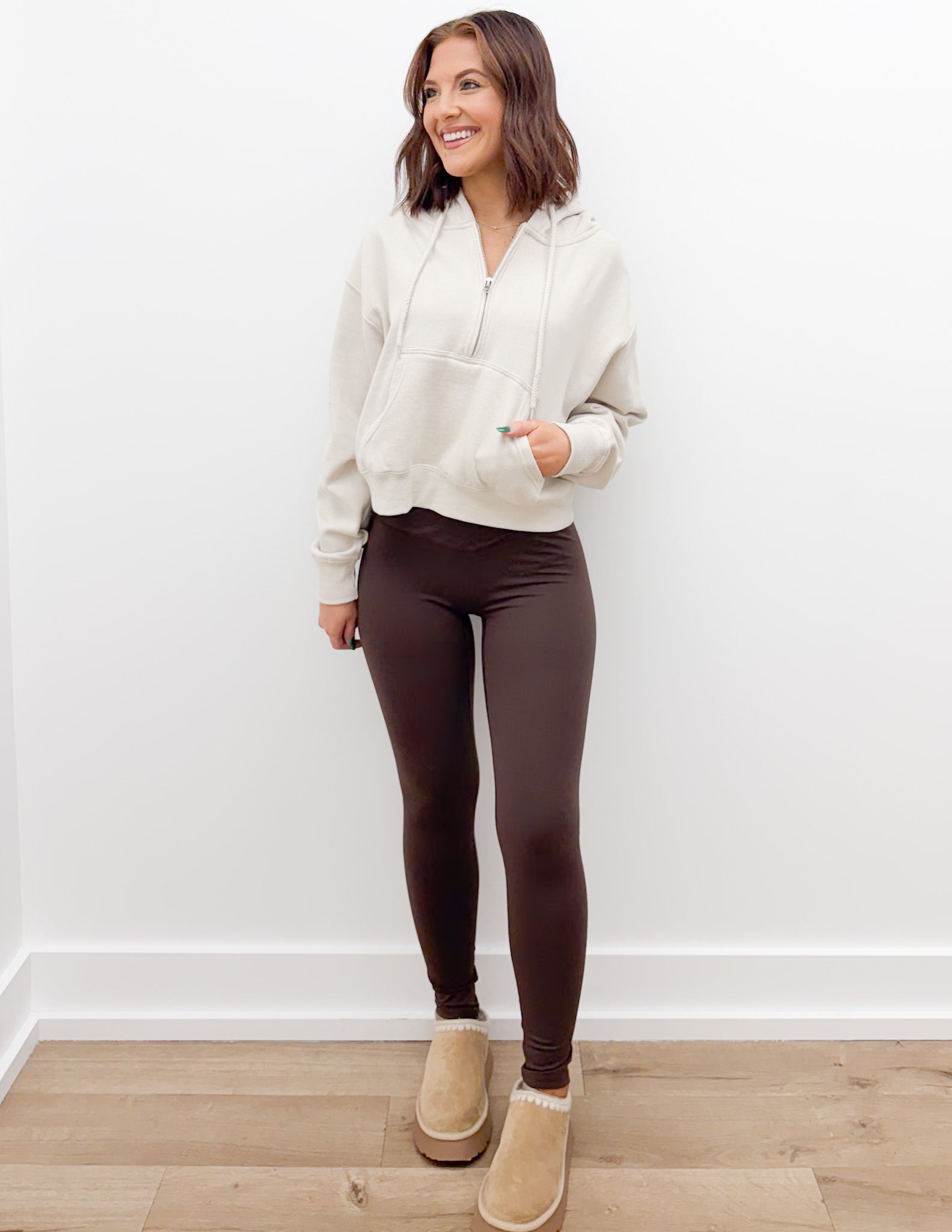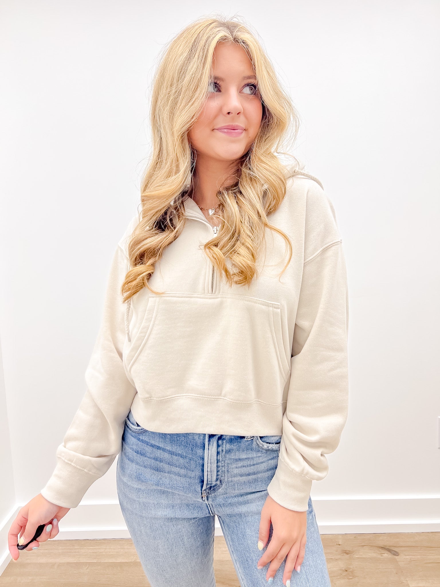 Loving How I Am Living Basic Fleece Half Zip Hoodie in Beige