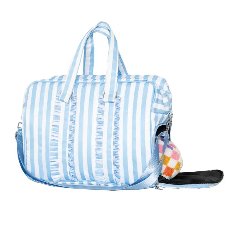 Adjustable crossbody strap extends to 56" zipper closure 4 interior pockets 2 external pockets exterior zipper shoes pocket 19" x 8.5" x 13" luggage passthrough sleeve Interior laptop sleeve
