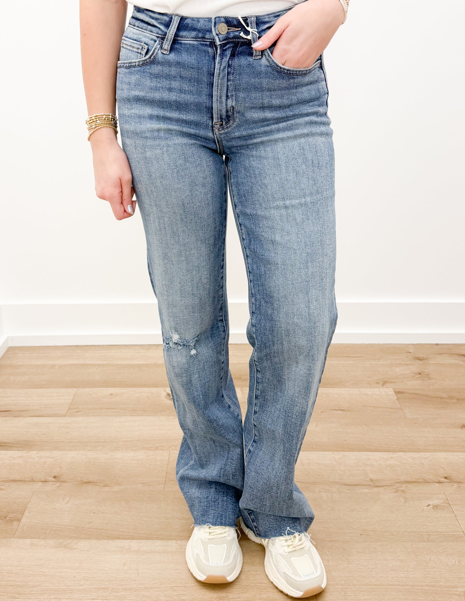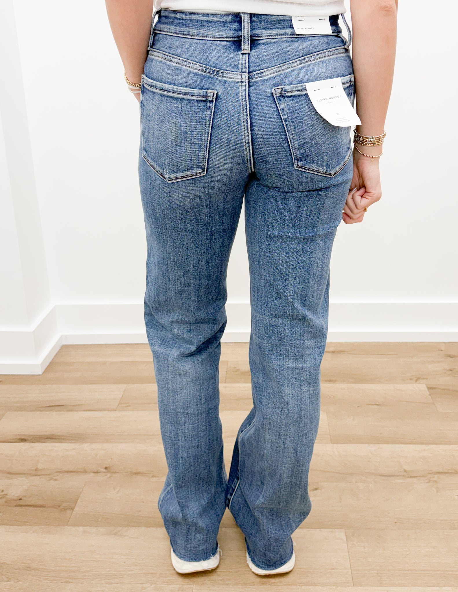 PRODUCT DETAILS:High rise frayed hem slim wide jeans Comfort stretch denim, high rise waist, distressed detail, frayed hem, full length, slim wide jeans ADULT FEMALE