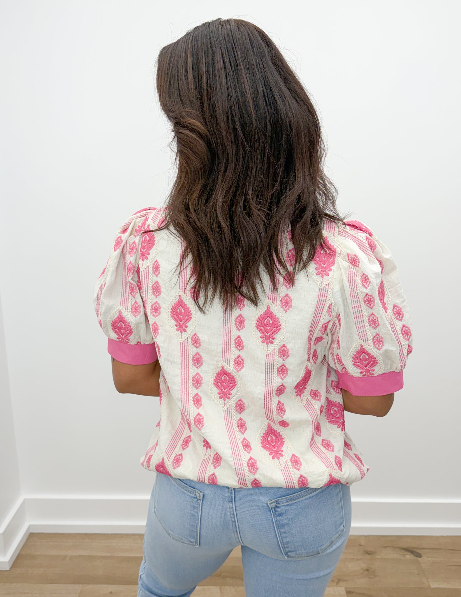 Abstract pattern embroidered short puff sleeve top featuring contrast accent caftan-inspired neck. Unlined. Woven. Non-sheer. Lightweight.