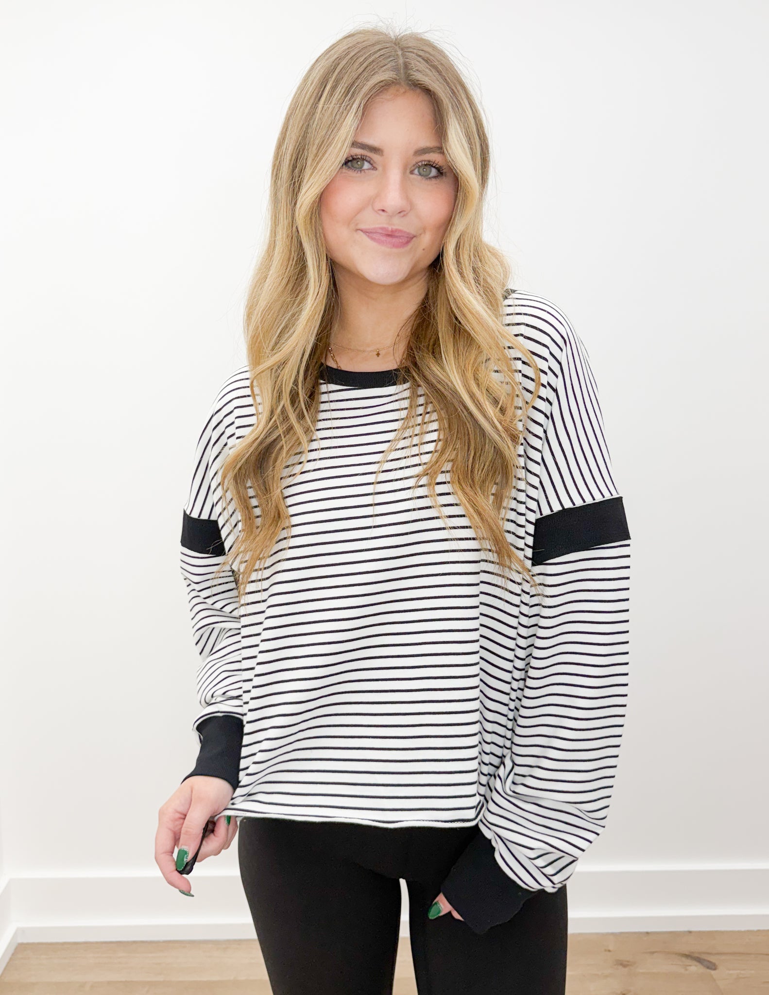Seems Like Yesterday Striped Cutout Back Sweatshirt in White/Black