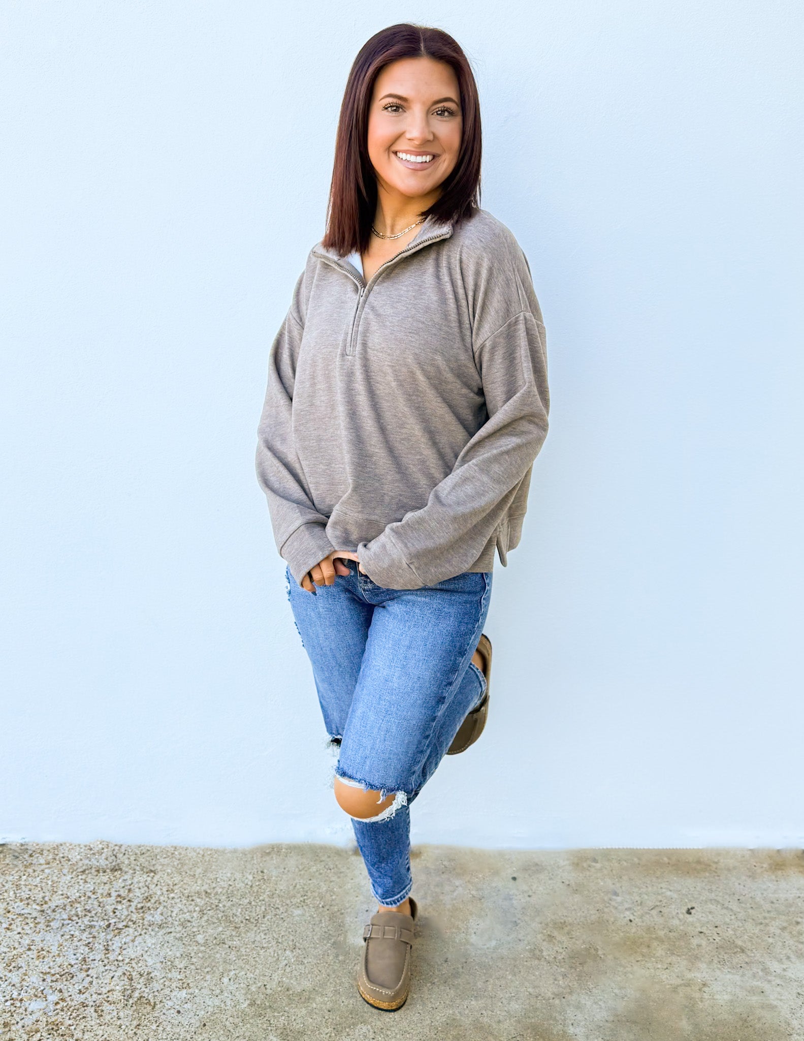 RELAXED CROP HALF-ZIP PULLOVER - SIDE SLITS, RELAXED, COMFORTABLE, CASUAL 77% POLYESTER, 17% RAYON, 6% SPANDEX