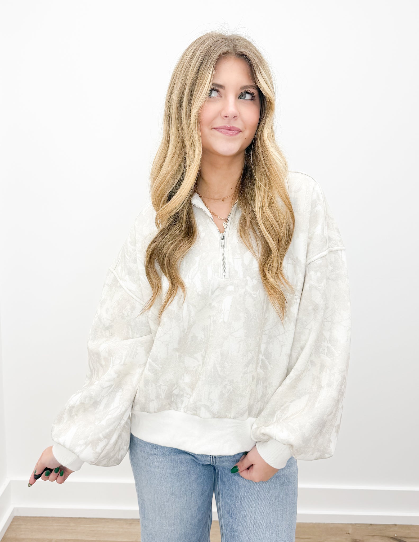 Obsessed is an understatement This half-zip pullover is all about chill vibes with its soft cloud-dye print and cozy fleece inside. The oversized fit high neck major comfy points, and the zip-up style gives it that cool-girl edge. Rock it with the matching skirt or throw it on with jean either way, you’re gonna look Total closet fave