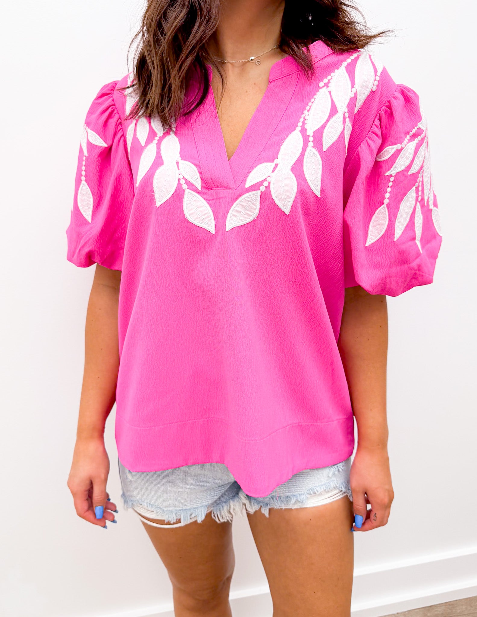Solid top with split neck, puffed short sleeves and leaf embroidered detailadult female