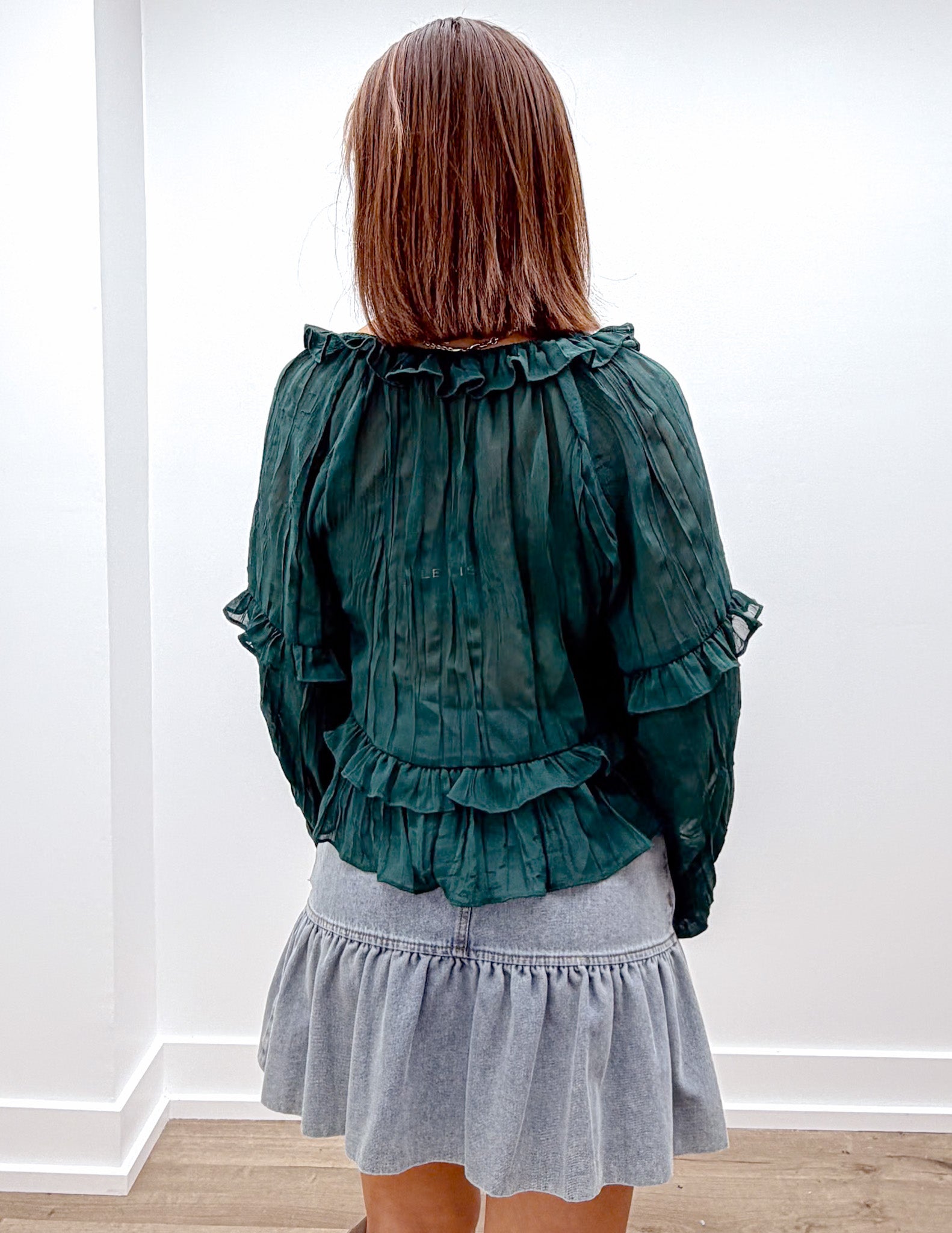 Running For You Scoop Neck Ruffle Blouse in Dark Green