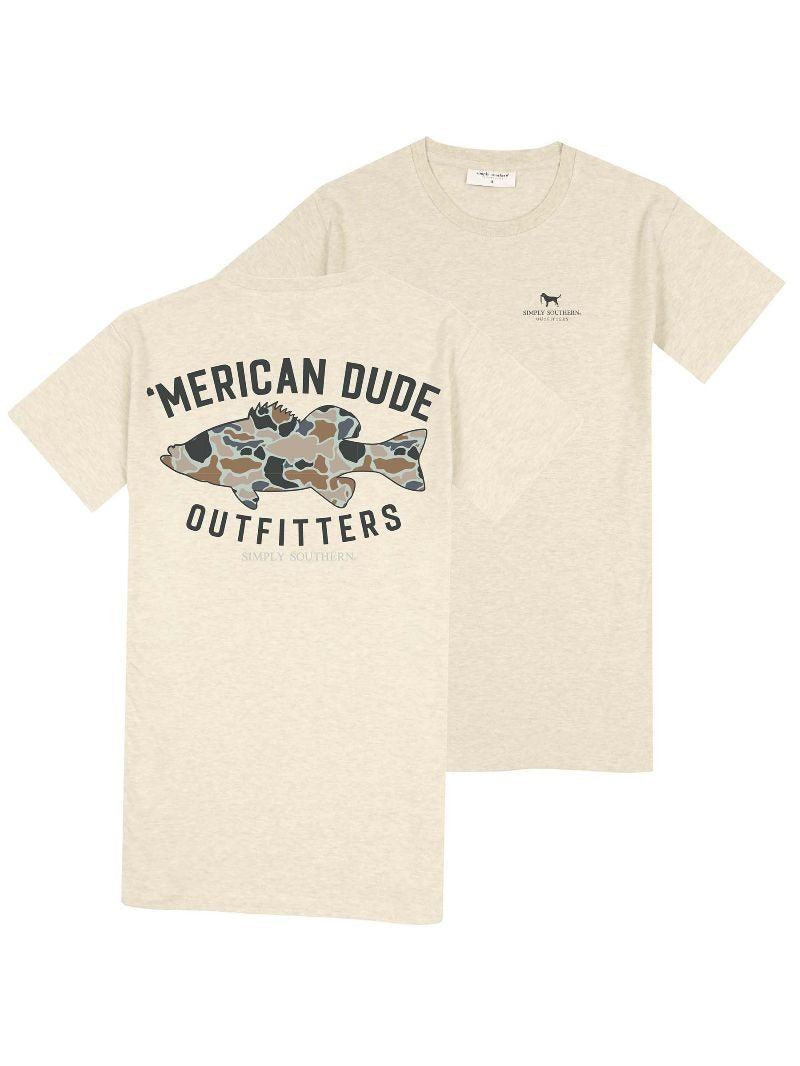 Oatmeal- Light heather brown short sleeve shirt with ''merican dude outfitters'.There is an outline of a fish filled with camoflauge pattern. Simply Southern logo below and on left chest. 98% cotton / 2% polyester blend.