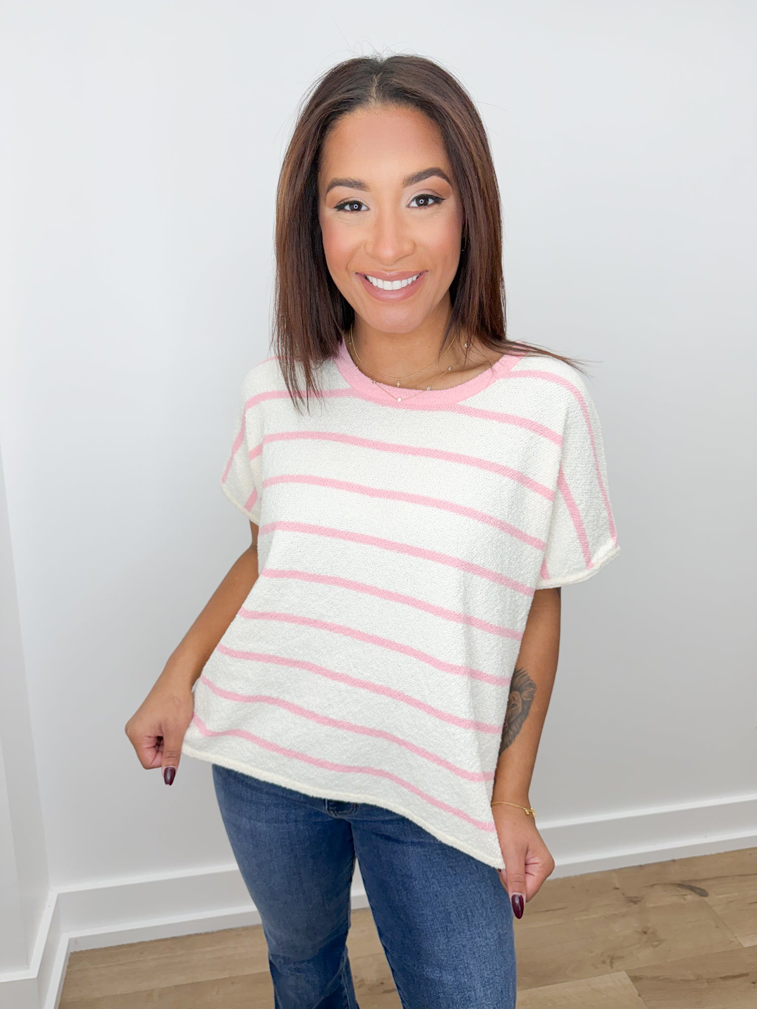 She Didn't Striped Oversize Sweater Top in DK Pink