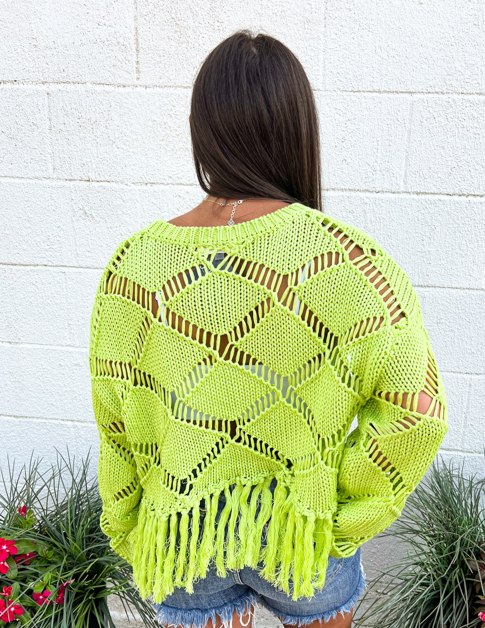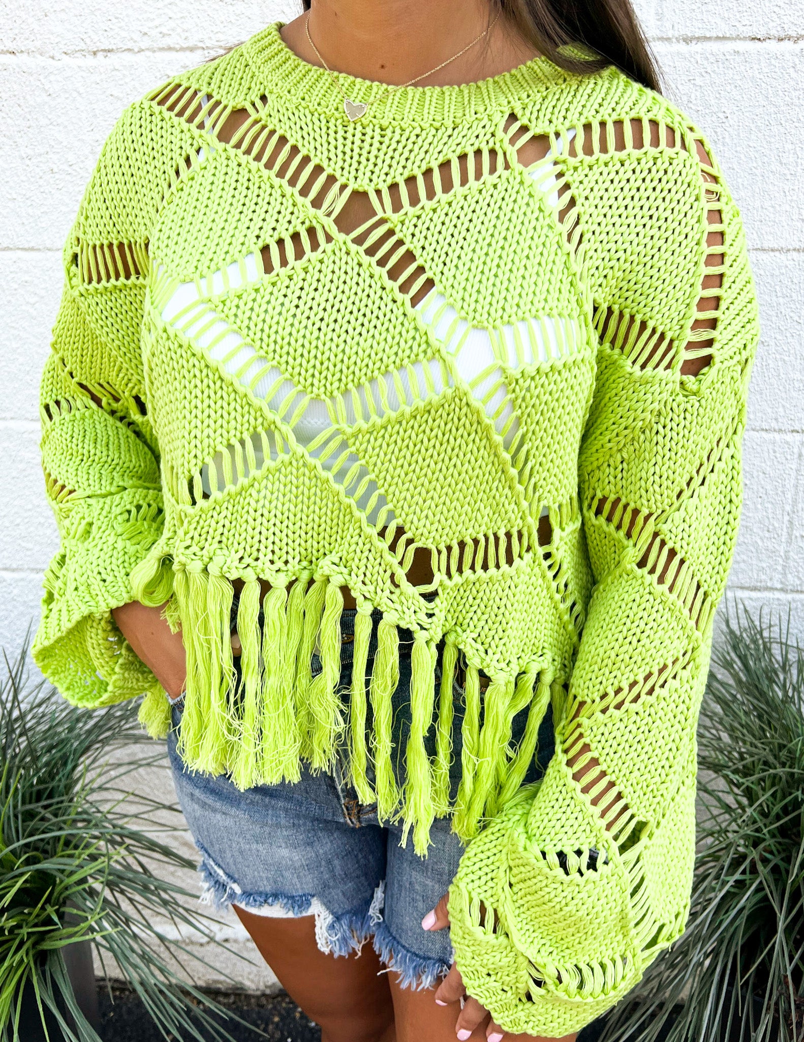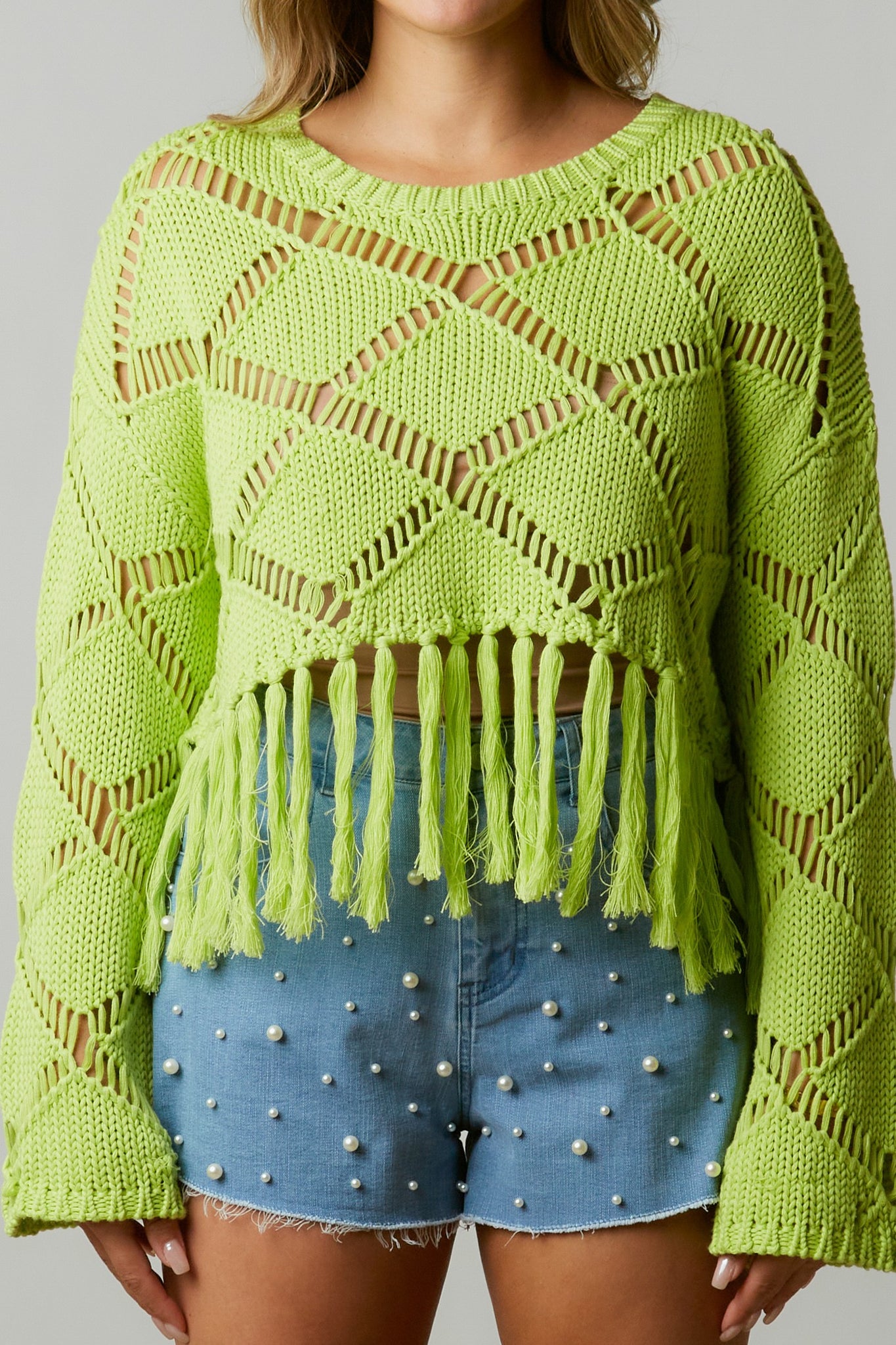 Diamond open-stitch Knit top with fringed hem