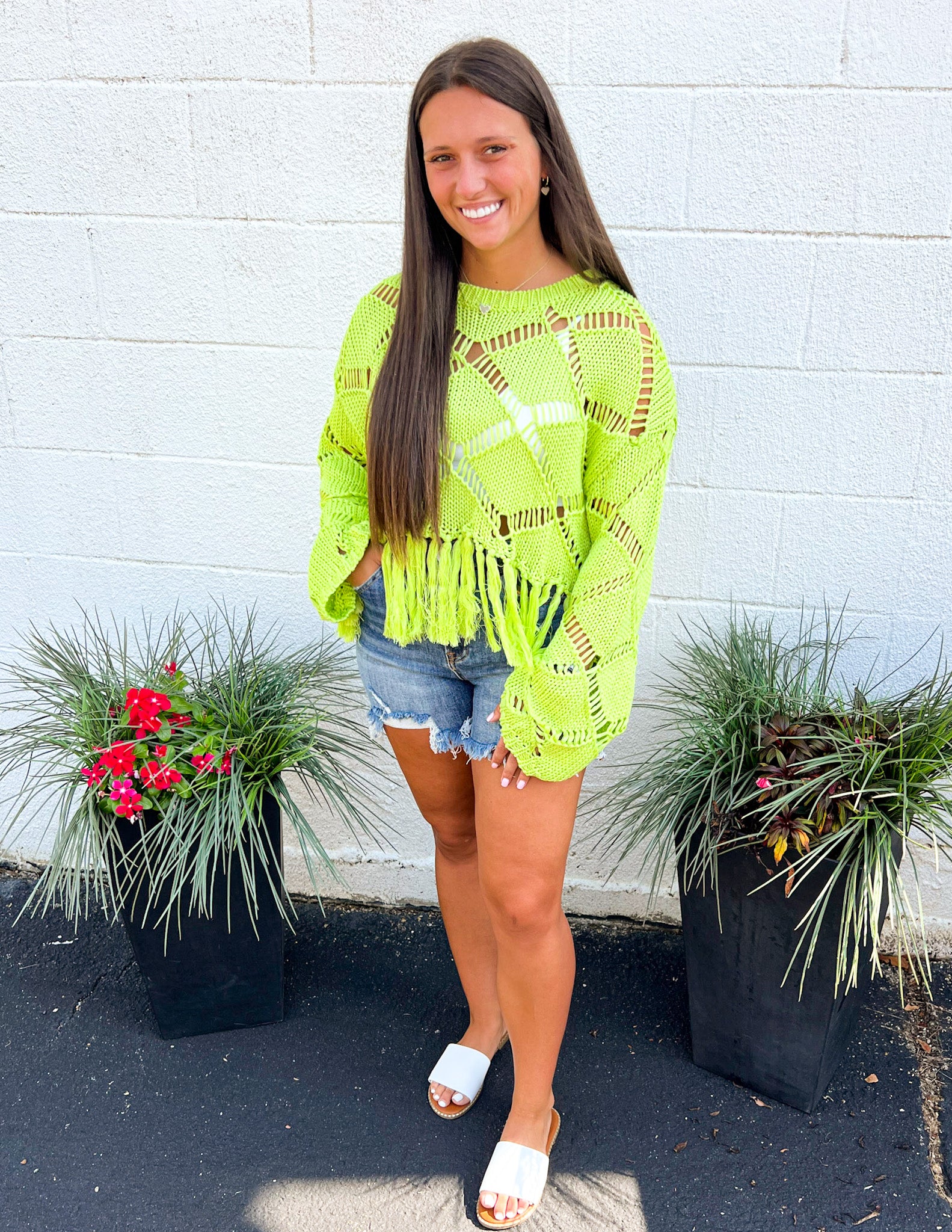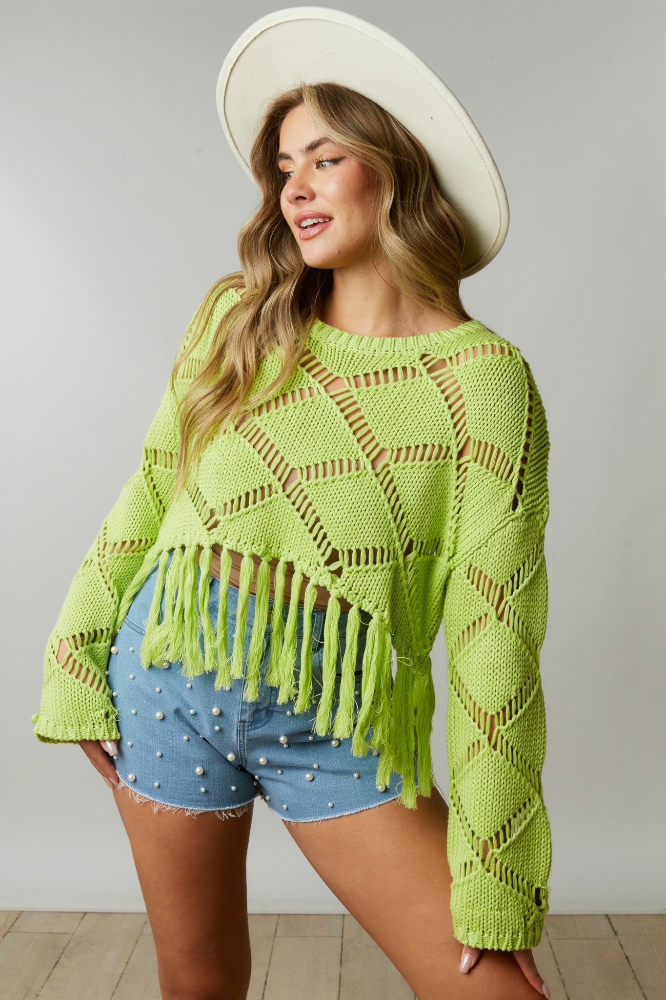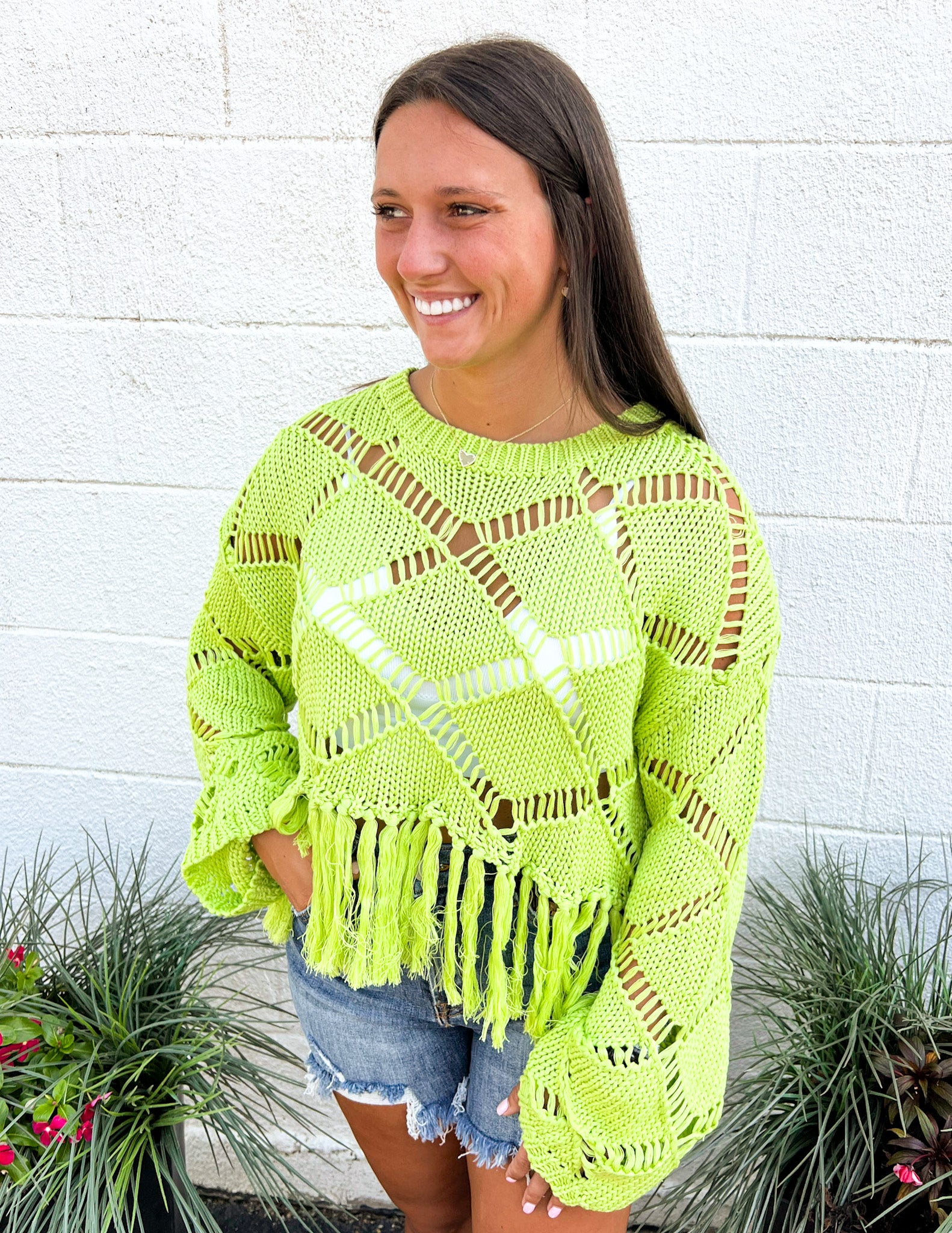 Diamond open-stitch Knit top with fringed hem