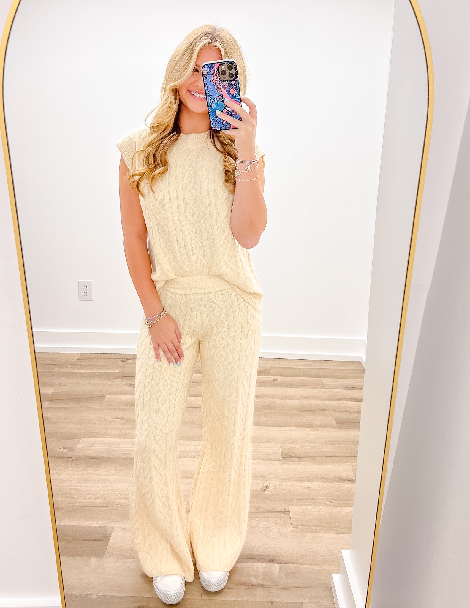 With an easy elastic waistband, wide-leg silhouette, and soft cable knit texture, these pants are the definition of throw-on-and-go. Whether you’re curled up on the couch or running to grab another PSL, you’ll stay comfy and pulled together. No effort required.