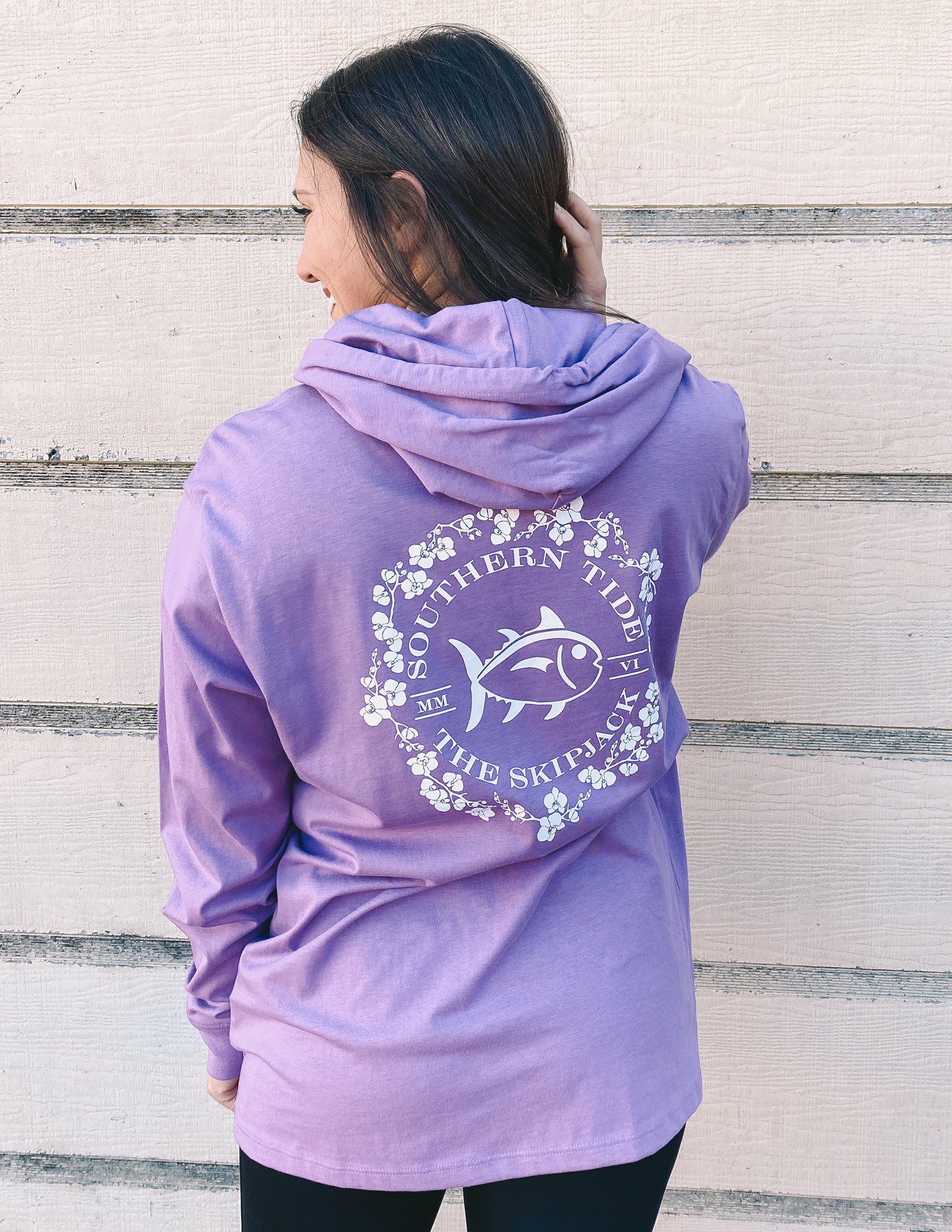Our cozy hoodie t-shirt featuring the classic Skipjack graphic encircled with a floral motif for a touch of femininity. This men’s fit hoodie is designed with comfort and relaxation in mind.